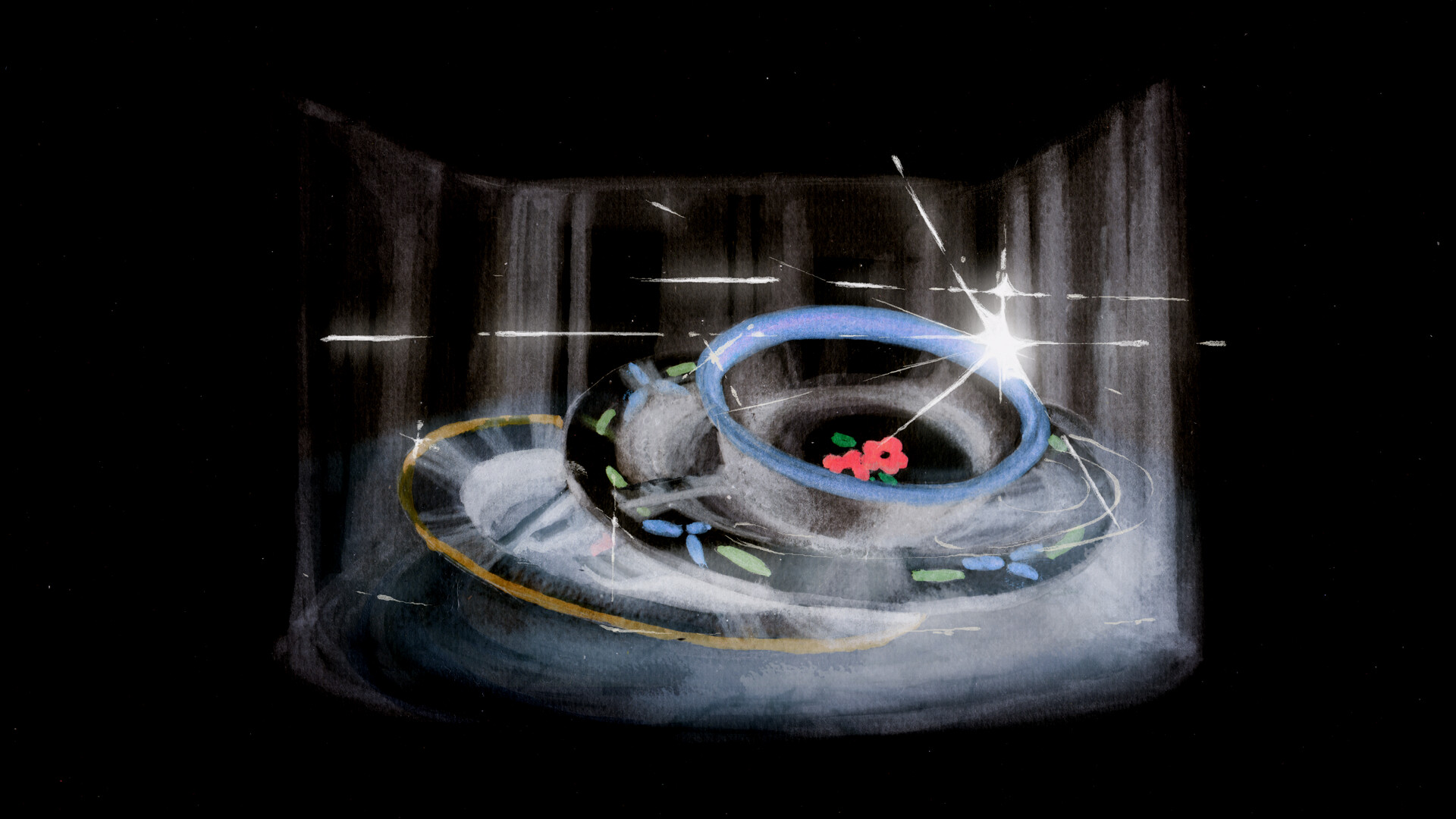 Anılardan oluşan ütopik sembolik oyun alanları, keskin ve titrek ışıklarla birbirine bağlanır.