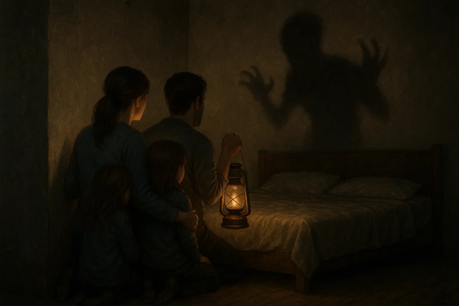 Yağmurlu bir gecede, dört kişilik bir ailenin küçük evindeyiz. Gök gürültülerinden uyuyamayan iki kardeş, korku içinde anne ve babalarının yatağına girerler. Ancak tam o anda, farklı bir ses daha duyulur; bu ses gök gürültüsüne benzememektedir. Baba doğrulup gece lambasını açmak ister, ancak elektrikler gitmiştir. Çekmeceden bir fener çıkarır ve sesi geldiği yöne doğru tutar; fakat karşısında sadece boş bir duvar vardır. Tekrar yatağa dönerler. Bir süre sonra anne, küçük çocuklardan birinin elinde fenerle duvara doğru bakarak beklediğini fark eder. Çocuk, kardeşinin duvarın içinde olduğunu söyler. Duvarda koyu bir karanlık lekesi vardır; fener ışığı ona tutuldukça küçülür ve hareketsiz hale gelir. Baba ve anne, feneri karanlığa yaklaştırır. Baba, eliyle karanlığı aralayarak içerideki kızını kurtarır. Tam o anda fener yere düşer, birkaç kez kıvılcım çıkararak titrer. Fakat karanlık daha fazlasını istemektedir. Fenerin ışığı odayı yeniden aydınlattığında, aile artık orada değildir. Sabah olduğunda, mahallede sadece küller, yıkıntılar ve inatla çalmaya devam eden bir çizgi film kalır.